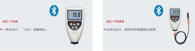 安妙涂层测厚仪(标准型)分为两个类型:AC-110A(整体式)、AC-110AS(分体式);应用广泛、测量准确,几乎可以测量所有的基体,无论是铁基还是非铁基;并且带有USB数据连接和蓝牙传输功能;整体式仪器适合单手操作并且测量更加稳定,因为在测量中,大类型探头的大接触面具有更好的稳定性,使用户得到一个持续且重复性强的精确测量结果;分体式提供多种探头,测量机动性更强。