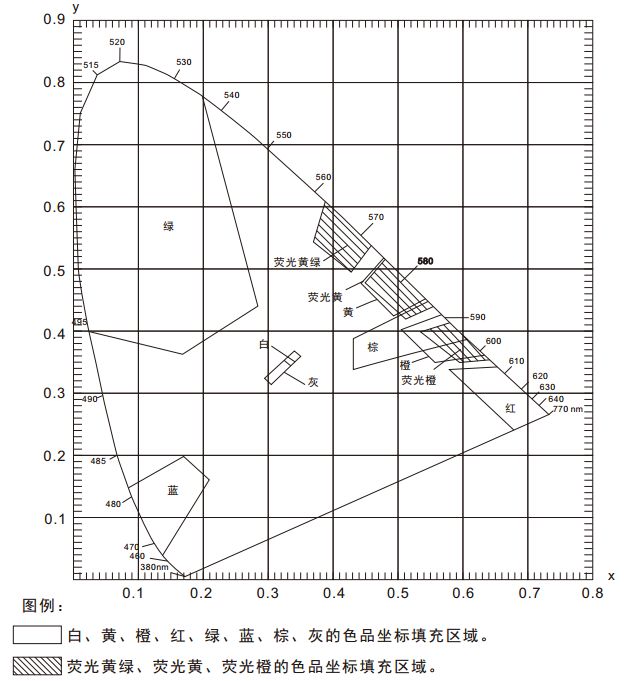 在《GB2893安全色》、《GB/T18833道路交通反光膜》等相关标准中,通常给出一块颜色区域(多个色品坐标点)和亮度因数要求,在D65/A光源和45/0几何条件下,判定样品是否落在对应的颜色区域内,借此判定样品是否满足标准规定的色度要求。由于颜色区域为多边形,如下图所示,导致使用普通的分光测色仪无法完成判定。NS808测色仪配合SQCT软件的交通路标测量模块则可以轻松解决这方面的问题。