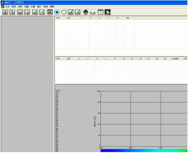 NS808的交通路标测试模块主要是通过上位机软件SQCT配合NS808仪器实现的。使用前需先安装好SQCT上位机软件,再连接NS808仪器,然后打开上位机软件,默认为普通测试界面,如图1所示,在该界面下可以完成CIEL*a*b、XYZ、ΔE*ab、ΔE*cmc、ΔE*00等色度数据的测试,详细菜单和工具栏的介绍请参照该软件自带“色彩管理控制软件使用说明书”,这里重点介绍交通路标测试模块。