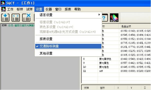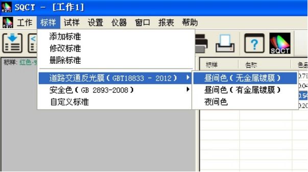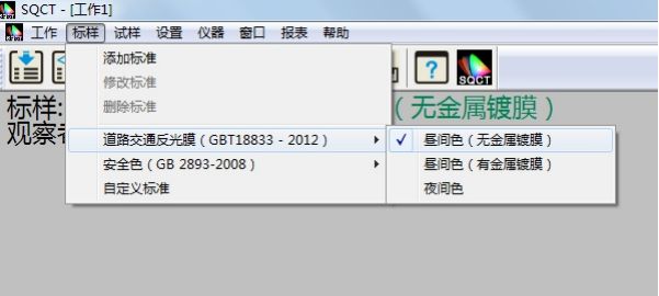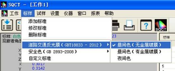 SQCT直接将《GB/T18833-2012道路交通反光膜样》的多边形颜色区域做入软件中,可以直接从菜单中选择,“标样->道路交通反光膜GB/T18833->昼间色(无金属镀膜)”如图11所示。