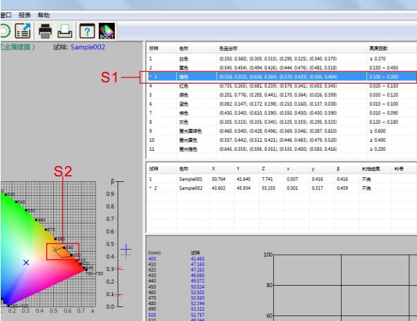 双击标样区域的蓝色,如图12中是S3所示部分,使蓝色为当前标样,蓝色多边形-容差标样(《GB/T18833-2012道路交通反光膜样》规定的蓝色区域)则显示在S4部分。