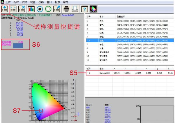 将测试样品放在NS808测量口径上,贴紧,鼠标点击试样测试快捷工具,如图13所示。大约1.5秒时间,完成测试,测试数据如图13中S5所示,在色品坐图中的位置如S7所示,仿真及判定结果如S6部分所示。