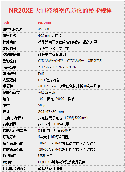3nh NR20XE是以45°/0°光学几何结构所设计的手提式电脑色差仪,其测量口径为20mm,是国内色差仪中的大口径仪器,且具