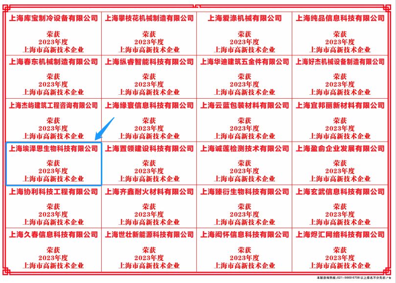 根据全国高新技术企业认定管理工作领导小组办公室近日发布的《关于公示2023年度上海市第三批拟认定高新技术企业名单的通知》,上海埃泽思生物科技有限公司通过了高新技术企业认定,被列入“2023年度上海市第三批认定高新技术企业名单”。