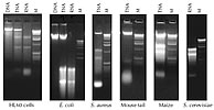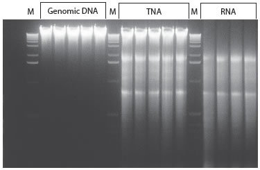 Figure 3 (click to enlarge). DNA, RNA, and total nucleic acid (TNA) purified from diverse cell sources using the MasterPure™ Complete Kit. M = kb ladder.