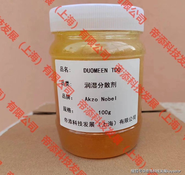 特征:DUOMEEN TDO是一种特殊的具有双离子、疏水长链的超强乳化润湿分散剂,适合在各种水性和油性体系中分散有机、无机颜填料粉体,具有极高的界面稳定活性,能够牢牢吸附在固体颗粒的表面,有效解决颗粒团聚、絮凝的问题,获得理想的分散效果。此外,该产品与亲水表面基材具有非常强的吸附能力,能够有效排斥水份在基材的界面吸附,改善涂层产品的湿附着力,可以极大地提高涂层的耐腐蚀性。