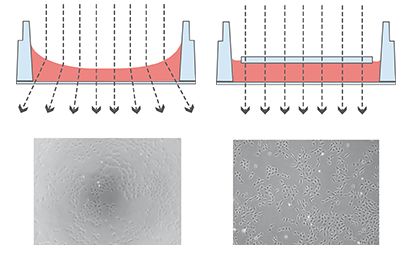 Phase contrast microscopy is the most commonly used, transmitted light technique in cell culture. When working with phase contrast microscopy, it is crucial to have the two phase rings adjusted to each other. In open wells, the meniscus at the air-water-interphase works like a lens that refracts the beam path. This miscalibrates the phase rings, leading to poor contrast in the microscopic image.