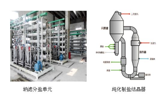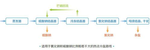 当废水中氯化钠比例占优势时,还可以采用膜法工艺,通过纳滤截留硫酸钠,纳滤产水进一步蒸发浓缩后结晶氯化钠,纳滤浓水蒸发浓缩后,先结晶硫酸钠,再冷冻结晶十水硫酸钠。少量母液采用结晶或干化形成杂盐。