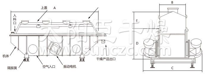 物料自进料进口进入机内,在振动力作用下,物料沿水平面流化床抛掷,向前连续运动,热风向上穿过流化床同湿物料换热后,湿空气经旋风分离器除尘后由排风1:3排出.干燥物料由排料进口排出。