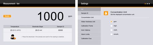 · 电极管理可储存3个离子电极斜率并调用各电极的校准数据。