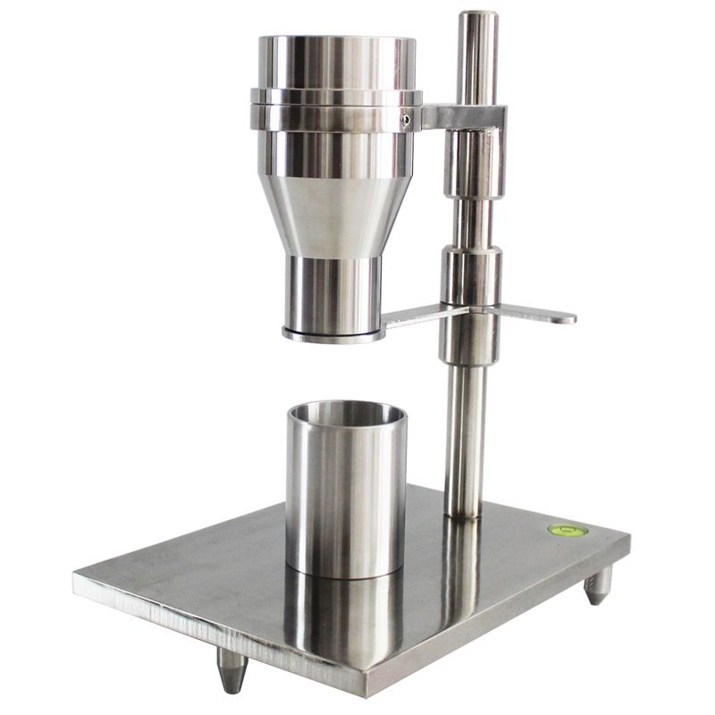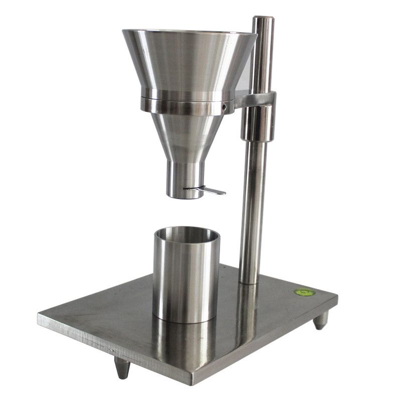 漏斗角度:20度;漏斗上口径为91mm;出料口内径:10mm,不锈钢材质,配有出口控制阀门和挡板;漏斗与量杯高度可以调节,量杯口径为:45mm;容积:100ml±0.5ml,不锈钢材质