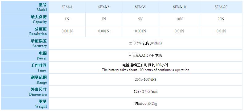 SEM系列数显式张力计是新一代通用型便捷式低功耗张力测试仪器。具有体积小、重量轻、容易携带、多功能、高精度等特点,适用于继电器接点压力、电子开关、微型自动电话设备接点和衔铁压力等机械压力、磁带录音机缓冲装置压力等接触点压力和张紧力的测试。