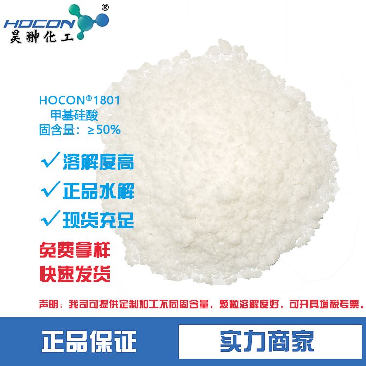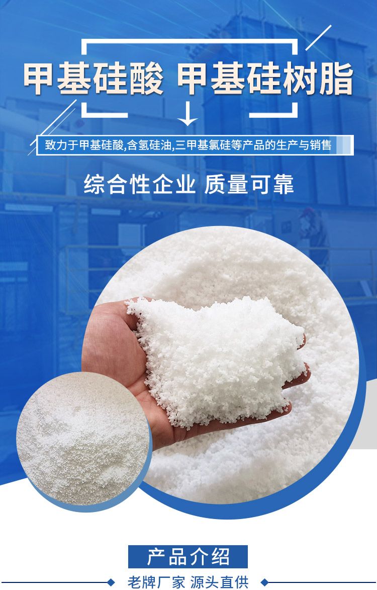 本品又称甲料(一甲硅树脂),是由一甲基三氯硅烷经水解、水洗、离心脱水精制而成。具有良好的憎水性能。产品为白色粉粒状固体,一般酸度<1%,水分<40%