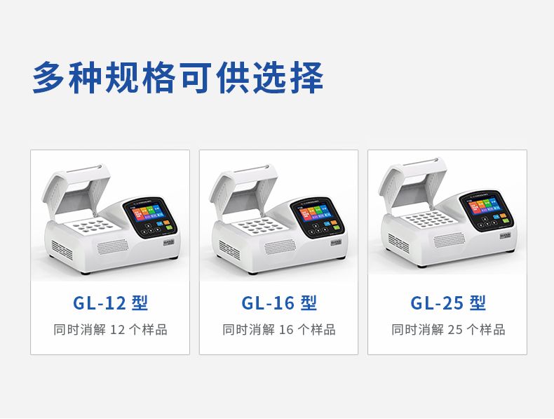 消解温度及时间可根据所需检测的样品需求进行设定,并且可根据客户需求提供:(12孔GL-12型)、(16孔GL-16型)、(25孔GL-25型)的智能消解仪。