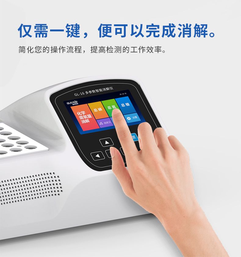 1、仪器搭载glos智能消解程序,可实现COD、总磷、总氮及总铬项目中一键消解。