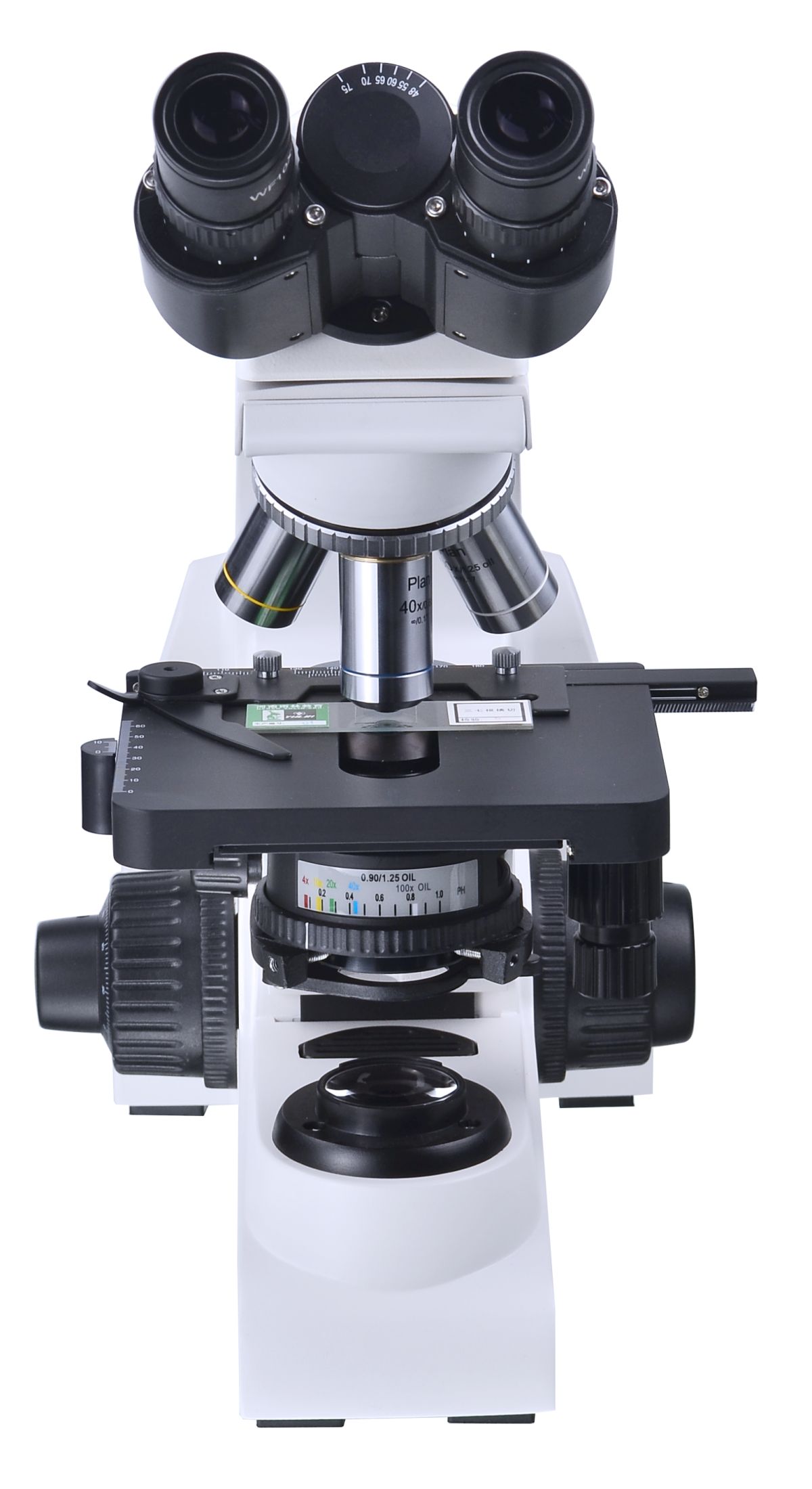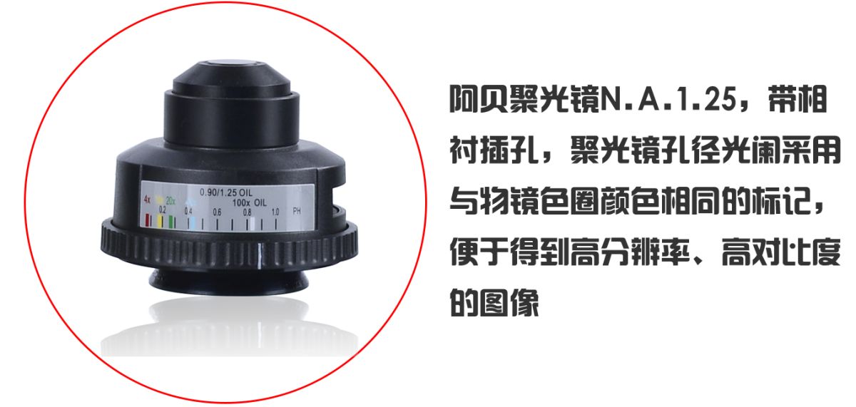 | 聚光镜 | 阿贝聚光镜,数值孔径NA1.25,中心可调,带相衬板插孔,配孔径光阑调节装置,聚光镜孔径光阑采用与物镜色圈相同颜色标记,带物镜倍率标识 | ● |