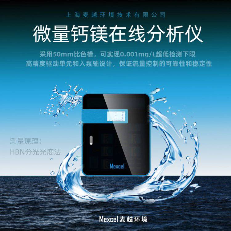 测量原理:在线自动取样后,加入氢氧化钠和 HNB 显色剂溶液。静置一段时间后,测定初始吸光度值;再加入约 EDTA,测定最终的吸光度值。然后根据朗伯 - 比耳定律,使用测得的吸光度值计算钙和镁的浓度。其中,羟基萘酚蓝(HNB)是一种显色剂,在强碱性盐水中呈蓝色,当其与游离的钙和镁络合时,颜色变为红色;而在钙 - HNB 指示剂络合物中加入乙二胺四乙酸二钠盐(EDTA)后,指示剂将被释放出来,呈更深的蓝色,颜色的差别可以衡量样品中钙和镁的含量。