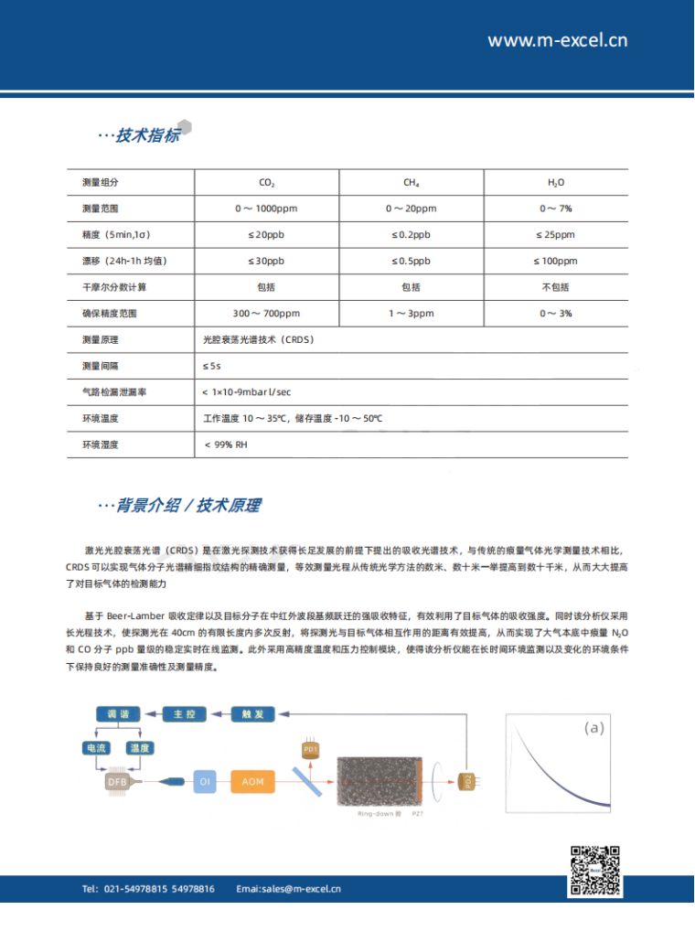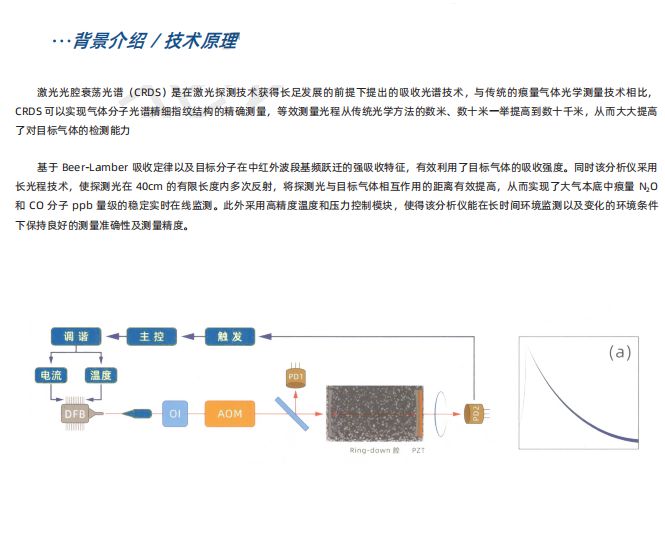 M-6508H高精度温室气体在线分析系统采用光腔衰荡光谱(CRDS)技术、激光经过光学隔离器(01)后,进入声光调制器(AOM),AOM 产生一级行射光斑经过模式匹配后进入衰荡光腔,PD探测透过衰荡光腔的激光信号,激光通过光快门在光腔投射最高时关断,被气体吸收后曲线会更快的衰减,通过对比有无目标气体的衰荡时间差异可以定量计算目标气体的浓度,可以监测 C0,、CH、N,O 等温室气体。