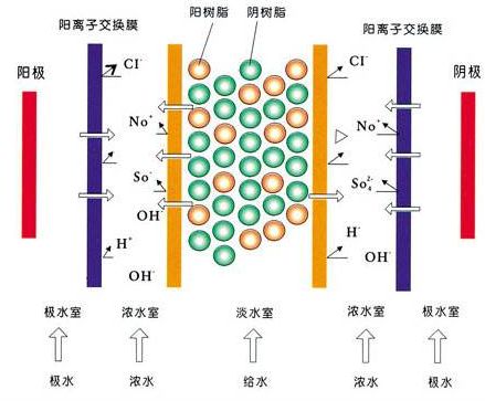 在EDI设备中,进水中的各种离子通过离子交换树脂后被脱除,水得到了纯化,此时是利用离子交换原理来脱除水中的离子。由于离子交换膜两边加有电压,水分子被电解为H+和OH-离子去再生树脂,同时被H+和OH-离子交换下的离子在稳压稳流电源的作用下,被迁移到浓水室排放,从而实现连续再生连续使用目的。