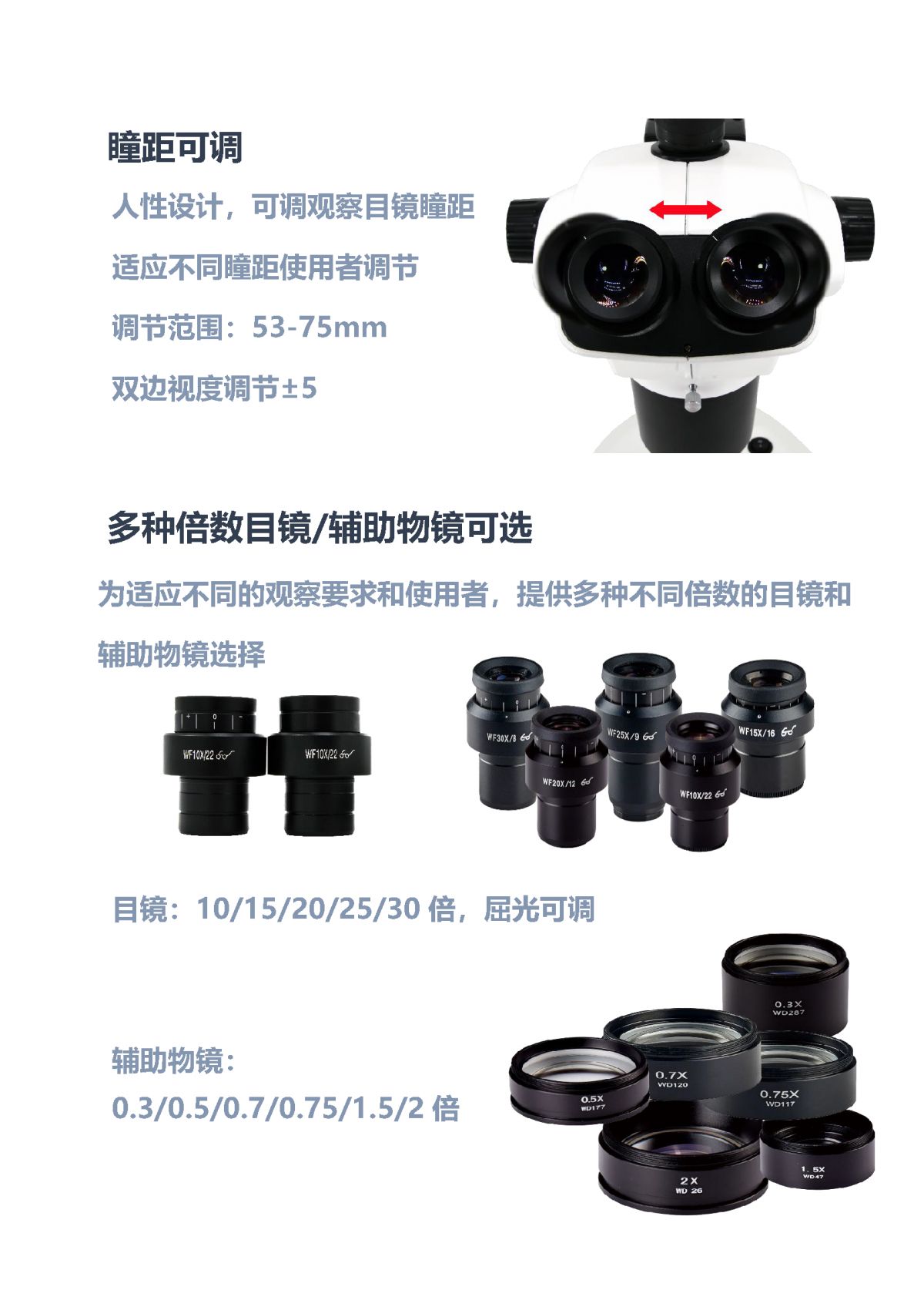 铰链双目,观察角度45°倾斜、360°旋转,瞳距调节范围53-75mm;双边视度调节±5(可选) | |