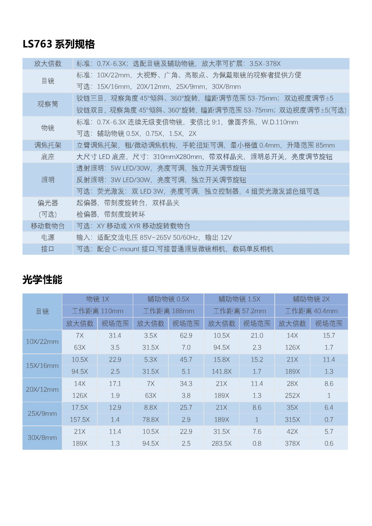 放大倍数 | 标准:0.7X-6.3X;选配目镜及辅助物镜,放大率可扩展:3.5X-378X |