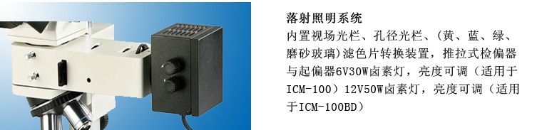 | 落射照明系统 | ICM-100 | 6V30W卤素灯,亮度可调 | |