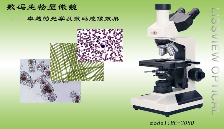 MC-2080数码生物显微镜配置平场消色差物镜、大视野目镜和数码三目镜,具有成像清晰,视野广阔,操作方便等特点,实现同步观察与显微图像动态显示,可广泛应用于生物学、医学、工业、农业等领域,是医疗、教学、科研等单位的理想仪器。