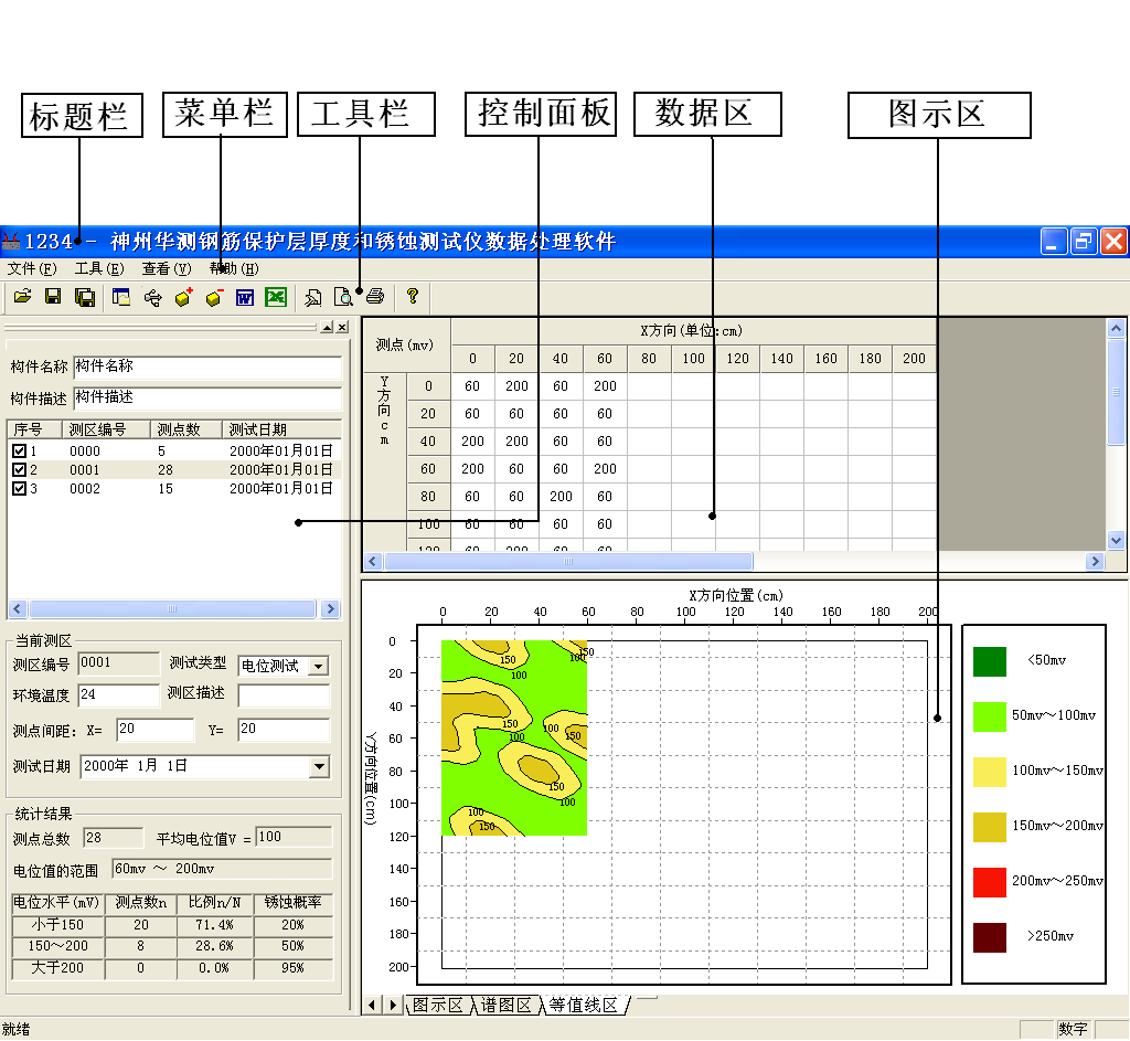 6、直观显示测试结果。采用了直接显示结果,数值越大,电阻率越高,腐蚀可能性越小;