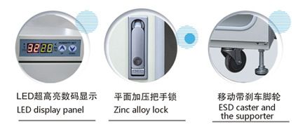 4、平面加压把手锁一体化设计,有防盗功能。可移动带刹车脚轮方便移动及固定。
