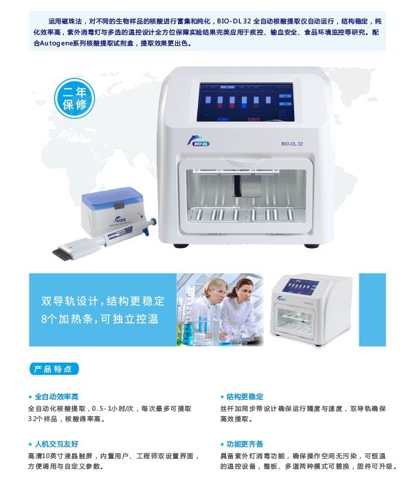 运用磁珠法,对不同的生物样品的核酸进行富集和纯化,BIO-DL 32 全自动核酸提取仪自动运行,结构稳定,纯化效率高,紫外消毒灯与多选的温控设计保障实验结果,应用于疾控、输血安全、食品环境监控等研究。