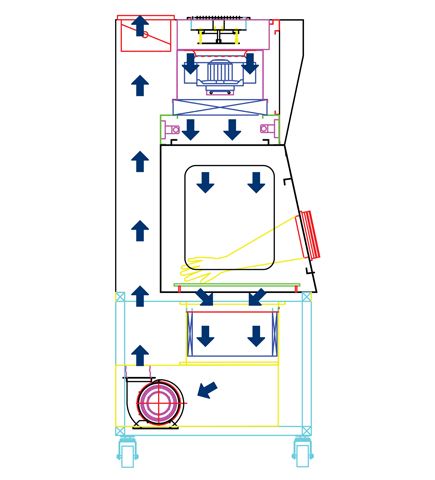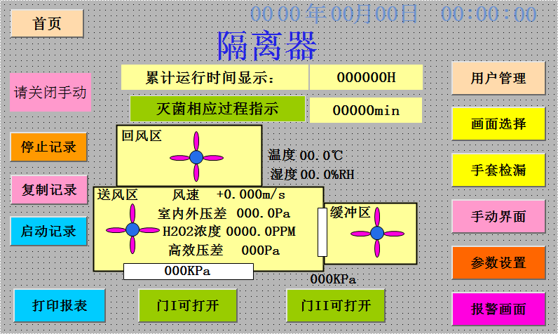 ![]() | 除湿——使隔离器内的空气循环通过除湿装置,将隔离器内的相对湿度降低下来,使VHP灭菌效率提高; 灭菌——输入过氧化氢蒸汽,并保持隔离器内预期的浓度,保持VHP浓度在700PPM以上,并保持灭菌时间30min以上; 除残留——停止输入过氧化氢气体,将灭菌系统切换到除残留系统,使隔离器内的过氧化氢气体循环通过催化器进行分解,降低过氧化氢浓度在10PPM以下,然后通过通风以达到残留值不大于1ppm。 检查工作状态——系统切换至洁净维持状态,按设定的工作风速和舱内的正压,自动变频调节送风量、回风量、新风量,保持舱内洁净度和正压状态,同时在线检测工作区洁净度,也可手动启动浮游菌采样。 |