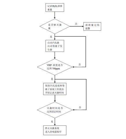 3.生物除污保持阶段:继续向灭菌舱输入过氧化氢等离子体,直至达到预设的浓度(一般以生物试纸验证浓度值为准)开始计时,在预设的浓度之上保持30~35min,生物除污完成(经验证30min灭菌效率达到6-log),停止过氧化氢汽化和等离子化;