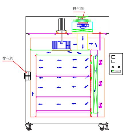 | 空气循环系统采用双电机水平循环送风方式,风循环均匀高效。风源由循环送风电机(采用无触点开关)带动风轮(Φ230)经由电热器,而将热风送出,再经由风道至烘箱内室,再将使用后的空气吸入风道成为风源再度循环,加热使用。保持室内温度均匀性。当因开关门动作引起温度值发生摆动,可介此送风循环系统迅速恢复操作状态温度值。 | ![]() |