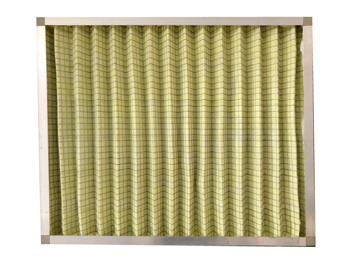 过滤材料是以折叠形式装入模切硬纸板内,迎风面积增大。流入的空气中的尘埃粒子被过滤材料有效阻挡在褶与褶之间。洁净空气从另一面均匀流出,因此气流通过过滤器是平缓和均匀的。视过滤材料不同,它所阻挡的粒径从0.5μm到5μm而不同,过滤效率也不同 。