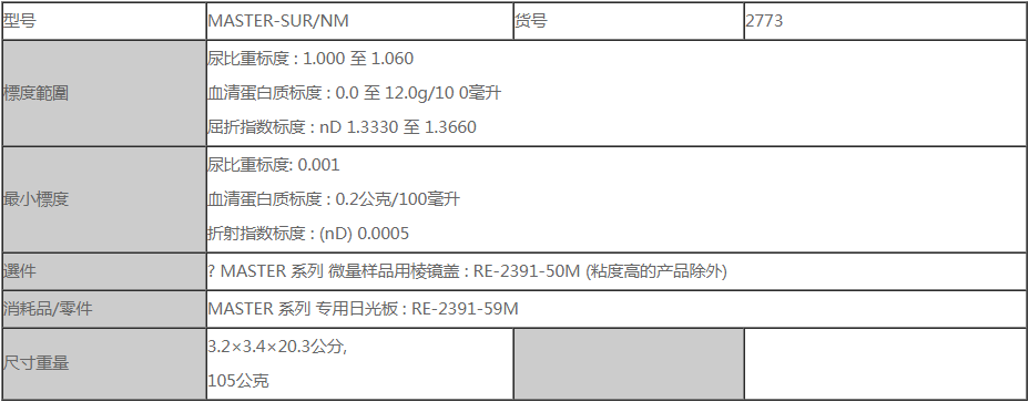 MASTER-SUR/NM是临床用折射仪,它是测量血清蛋白,尿比重以及折射率的产品。它在材料上采用的树脂具有耐盐性及耐酸性,可以防止腐蚀。与MASTER-SUR/NM不同,这款没有带防水功能及自动温度补偿功能。您可以手动校正。
