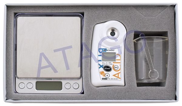 使用ATAGO(爱拓)糖酸度计,糖度可直接取样测量;酸度测量只需添加蒸馏水与测量样品按重量比例(1:50)稀释(即:果汁1ml,蒸馏水50ml)搅拌均匀后即可取样测量。糖度及酸度测量完成后,按R键自动显示糖酸比。