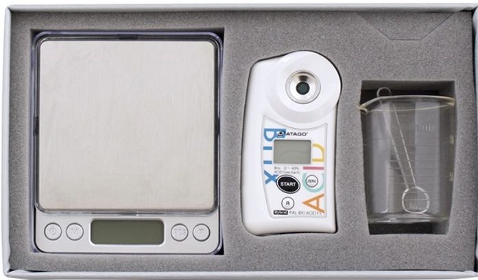 使用ATAGO(爱拓)糖酸度计,糖度可直接取样测量;酸度测量只需添加蒸馏水与测量样品按重量比例(1:50)稀释(即:果汁1ml,蒸馏水50ml)搅拌均匀后即可取样测量。糖度及酸度测量完成后,按R键自动显示糖酸比。