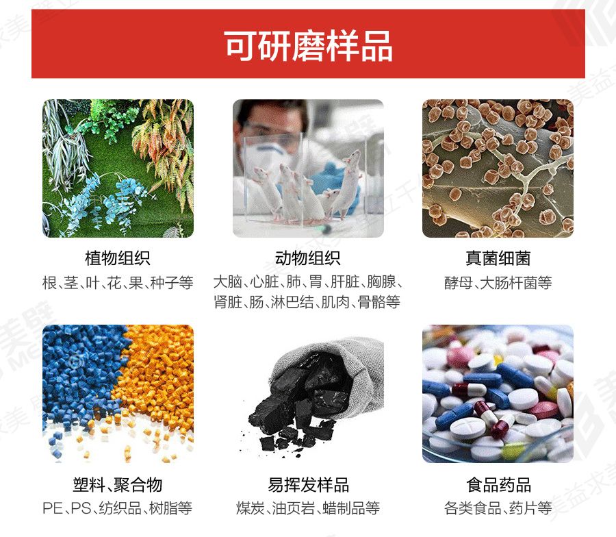 美壁系列研磨机采用了特殊的垂直上下一体震动模式,通过研磨珠(氧化锆、钢珠、玻璃珠、陶瓷珠)的高频往复振动、撞击、剪切。快速的实现目的。使研磨的样品具有更加充分、更均匀、样品重复性更好、样品之间没有交叉污染。