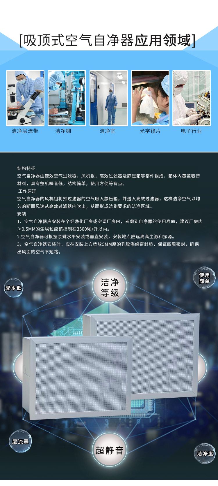 在工作台面可达到万级洁净级别(1ft3空气中≥0.5um颗粒约在1万颗左右)。