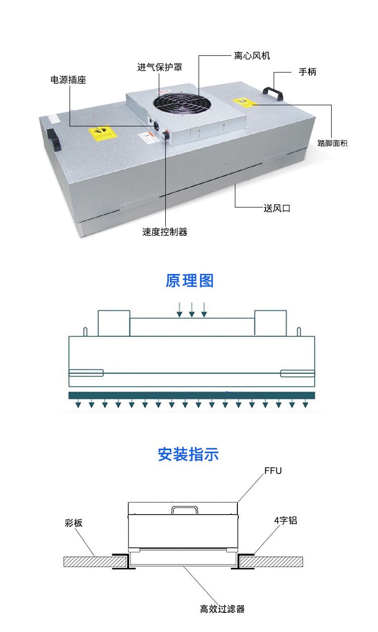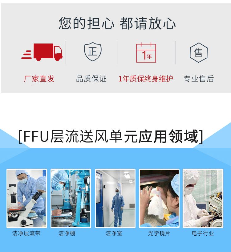FFU层流送风单元由于其体积小,安装简便,可模块化连接使用,因而被广泛应用于洁净室、洁净层流带、洁净棚等场合。