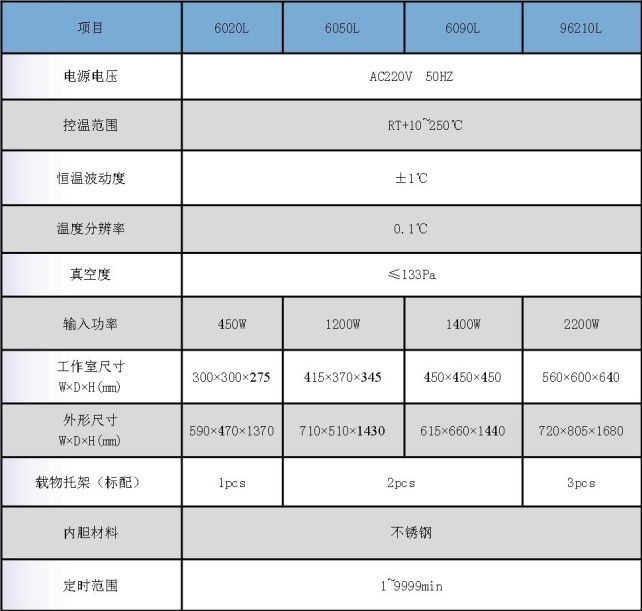 1:加热元件位于箱体内部隔板上与传统真空干燥箱相比加热时间缩短50%(除6050、6050B、6051外)。