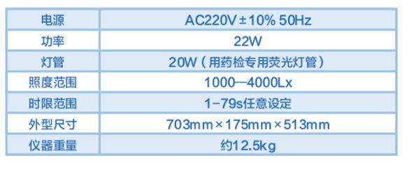 该仪器设计采用了药典规定的专用三基色照度连续可调荧光灯和电子镇流器组成的光源系统。工作装置背景采用了遮光板,黑色背景,检测 白板等提高了目检分辨能力与减小视觉疲劳。数字式电子照度计使用方便,稳定可靠,检测时间可以任意设定,并有声光报聱功能。