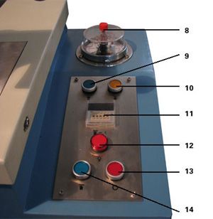 | 1、调节丝杠 2、压片模具 3、立柱 4、摆臂 5、压力表 6、操作板 7、液压站(右侧门内) 8、压力表 9、点动上行按钮 10、点动下行按钮 11、压片保压时间调节 12、电源指示灯 13、压样启动按钮 14、停止按钮 |