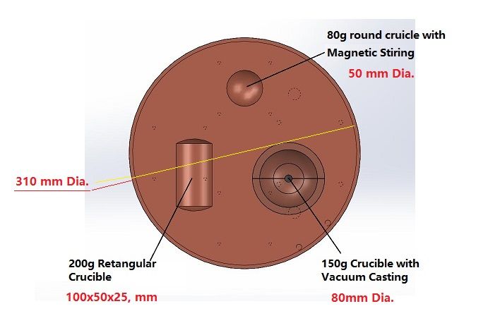 3、水冷铜坩埚 水冷铜坩埚带有3个不同的熔炼工位 1工位.最大熔炼量80g,带有磁力搅拌系统 2工位.最大熔炼量150g,带有真空吸注装置 3工位.最大熔炼量200g |