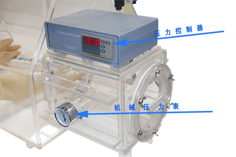 技术参数 | 1、电源:AC110V/220V 2、主箱尺寸:875mm×480mm×500mm 3、空气密封室尺寸:230mm×230mm×230mm 4、阀门:主箱设有2个电磁阀、1个手动阀,空气密封室设有2个手动阀 5、主箱压力控制范围:101 KPa -95KPa(系统默认),范围内可调整两个电磁阀控制压强 6、与操作环境相适应的压强:98 KPa -101KPa 7、空气密封室最大压强:10KPa(取决于塑胶强度) |