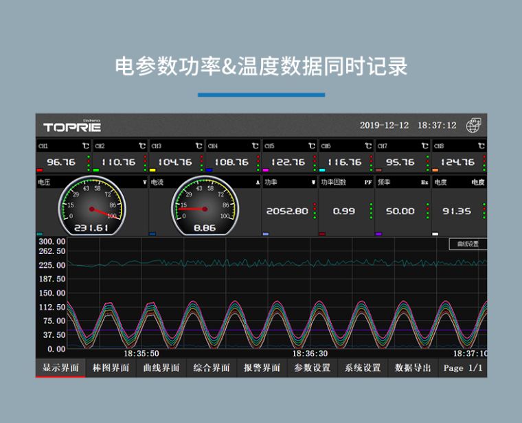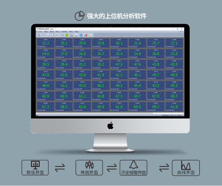 多种界面显示,强大的上位机分析软件,高清真彩显示画面,曲线界面,历史报警界面,数值界面,棒图界面等多种显示画面。