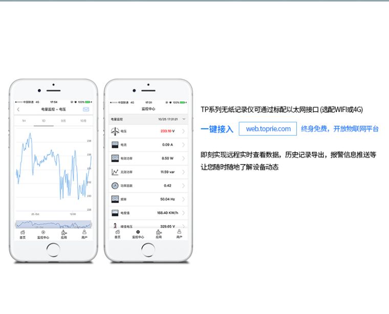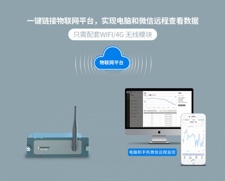 一键链接物联网平台,实现电脑和微信远程查看数据,只需配套4G/WIFI无线模块,即刻实现远程实时查看数据,历史记录导出,报警信息推送等让您随时随地了解设备动态。