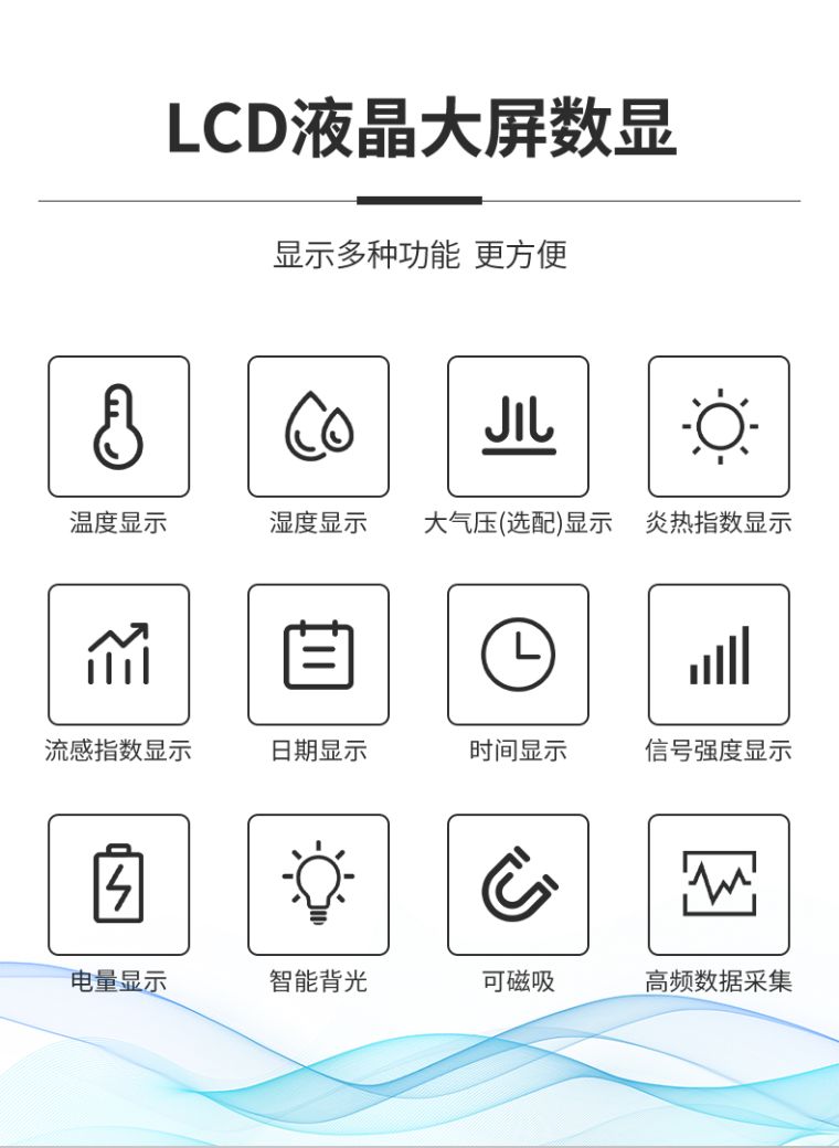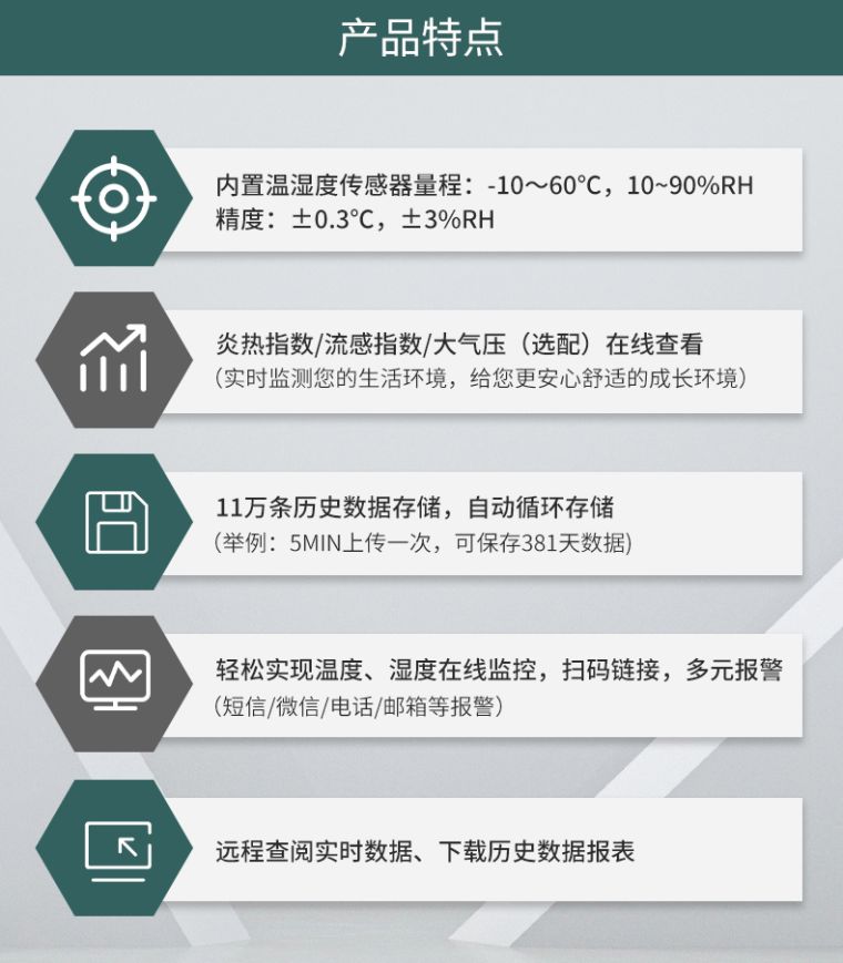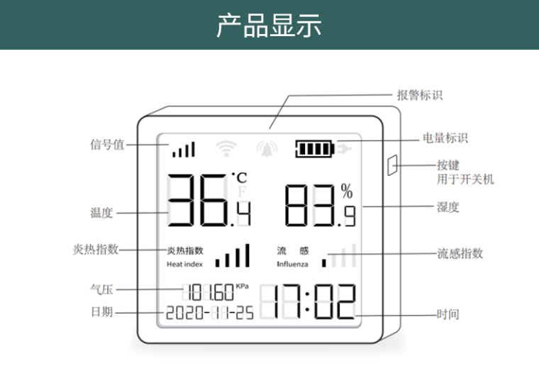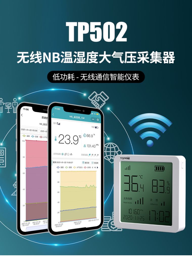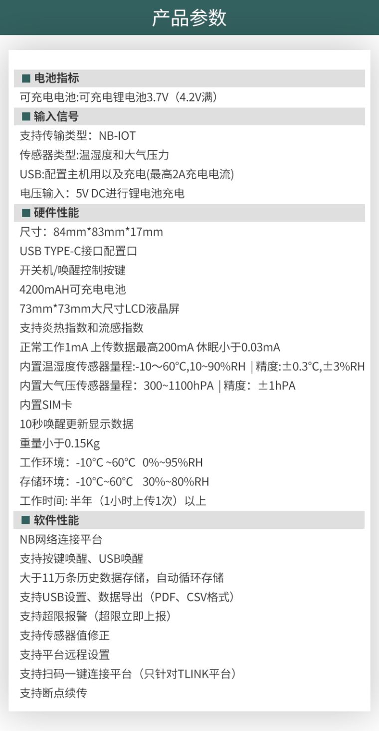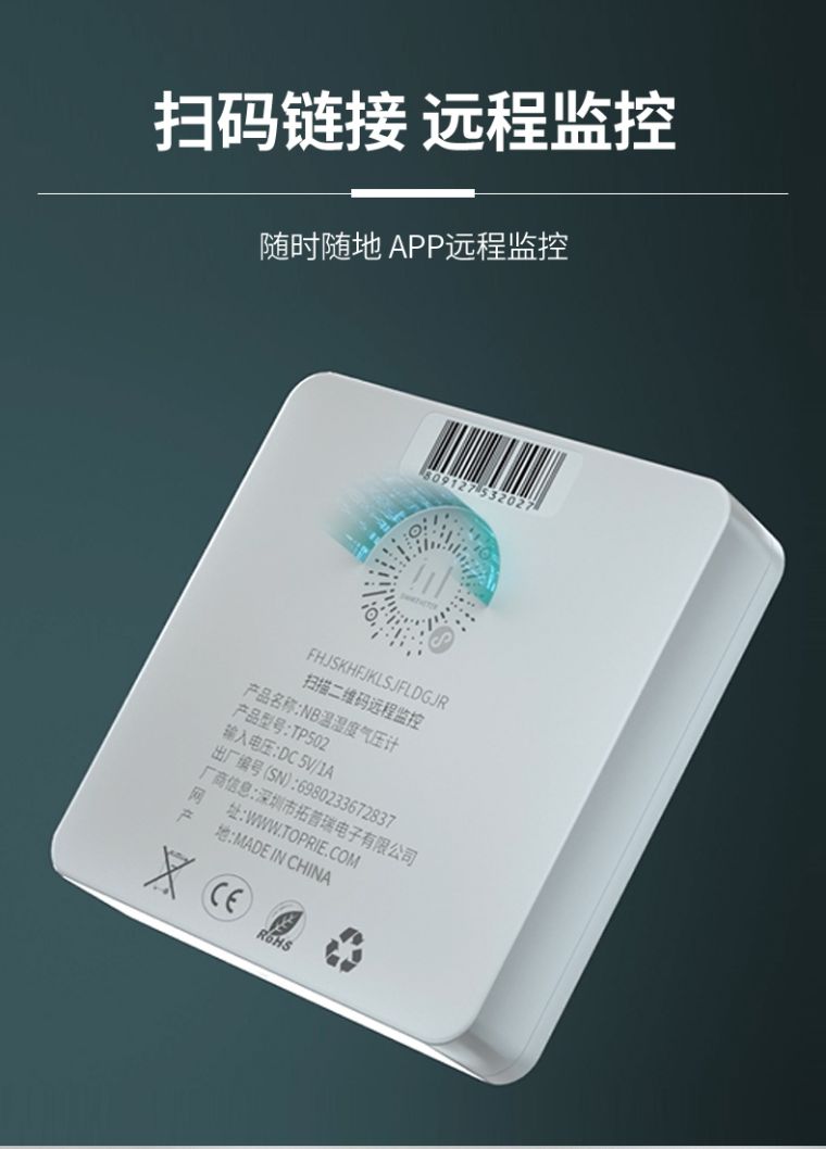 产品简介:大气压、温湿度三合一智能仪表,无线低功耗,充电五小时,待机180天;可对接第三方平台。