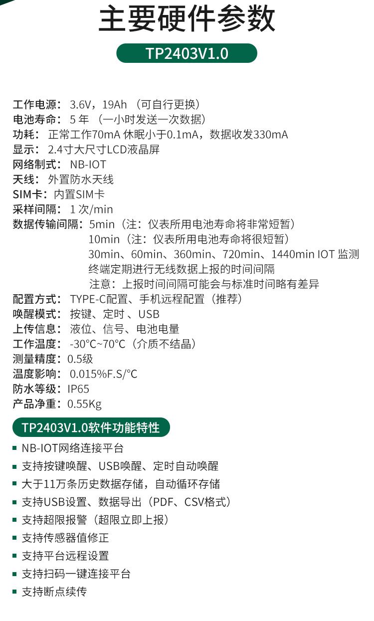 产品简介: 无线液位传感器采用0.5级高精度液位传感器,IP66防水等级高精度设计,2.4寸大尺寸液晶LED屏,5年超长寿命锂电池加持。