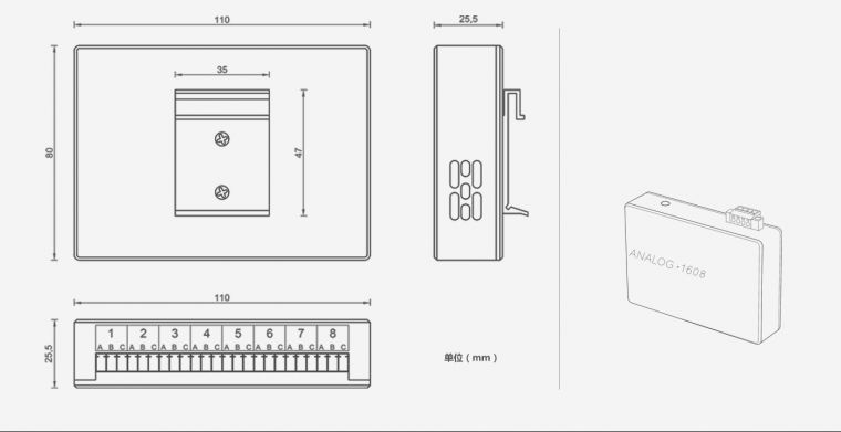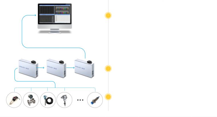采用工业级485接口小巧便携,可导轨安装。专业采集电压、电流、温度、湿度、压力、振动、频率、流量、液位等信息。